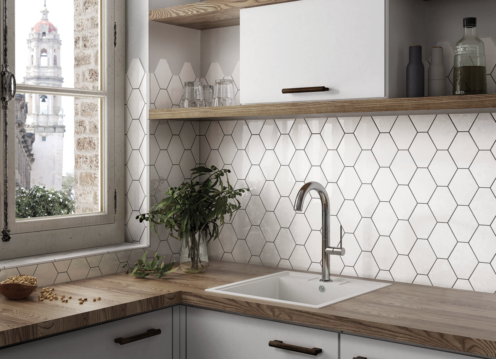 - Оливковий та евкаліптовий: зелені кольори, що домінують у святковому пакуванні та декоративному листі, втілюються у матовій плитці, яка додає кухні свіжості.