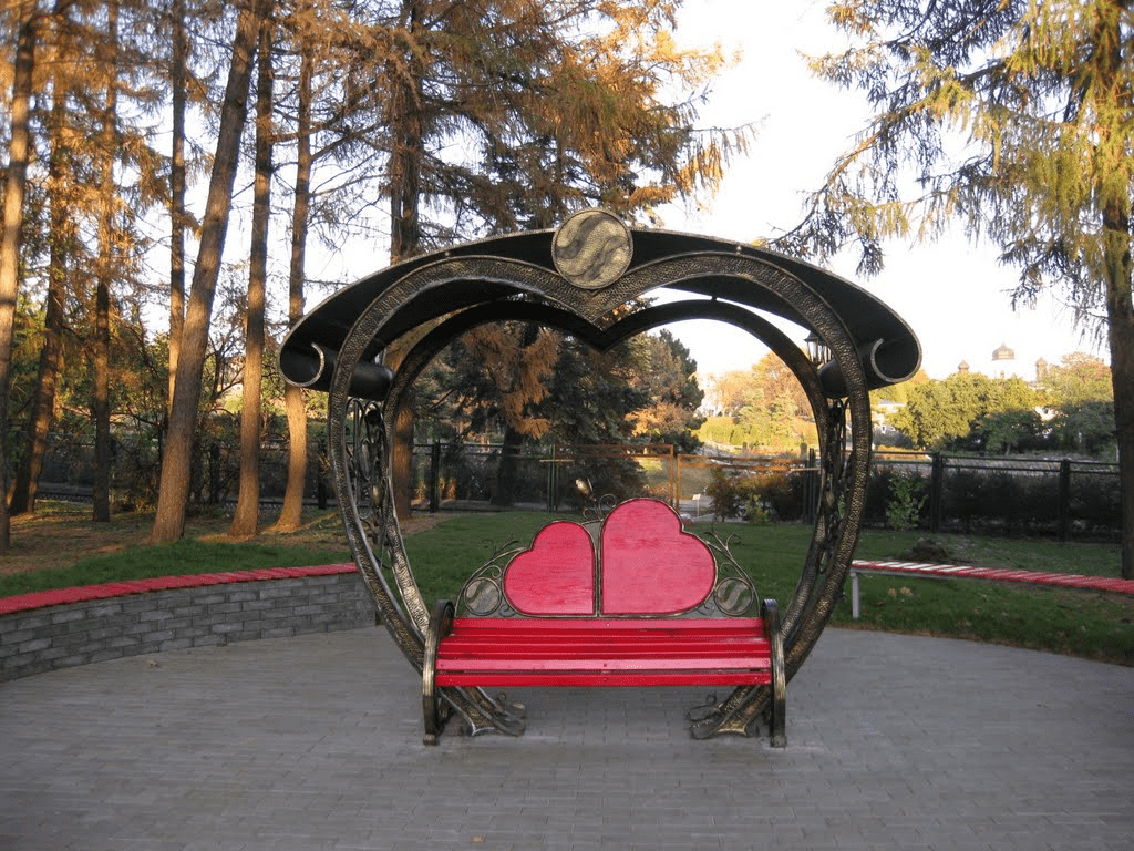 Разом зі своєю другою половинкою тут можна помилуватися зеленню навколо, цвітінням пролісків, бузку, айстр і троянд та співом птахів. Також і цьому місці знаходиться ось така незвичайна лавка для закоханих, де можна побути наодинці один з одним і відпочити від міської суєти посеред природи.