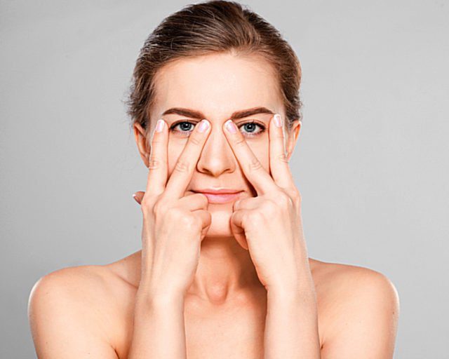 З’єднайте брови за допомогою міміки, для того щоб не з’явилися складки – натисніть вказівними пальцями на шкіру, яка зверху і зафіксуйте позицію. Здійсніть від 10 повторень тривалістю 5-6 секунд.
